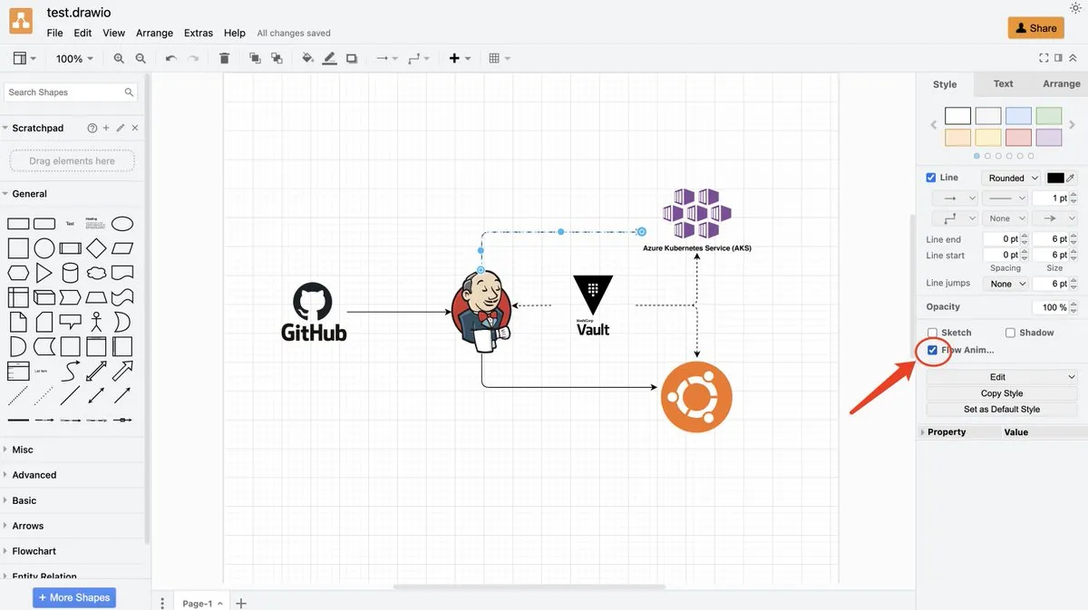 - 选中图中箭头,给箭头加上 Flow Animation,见图中的红圈